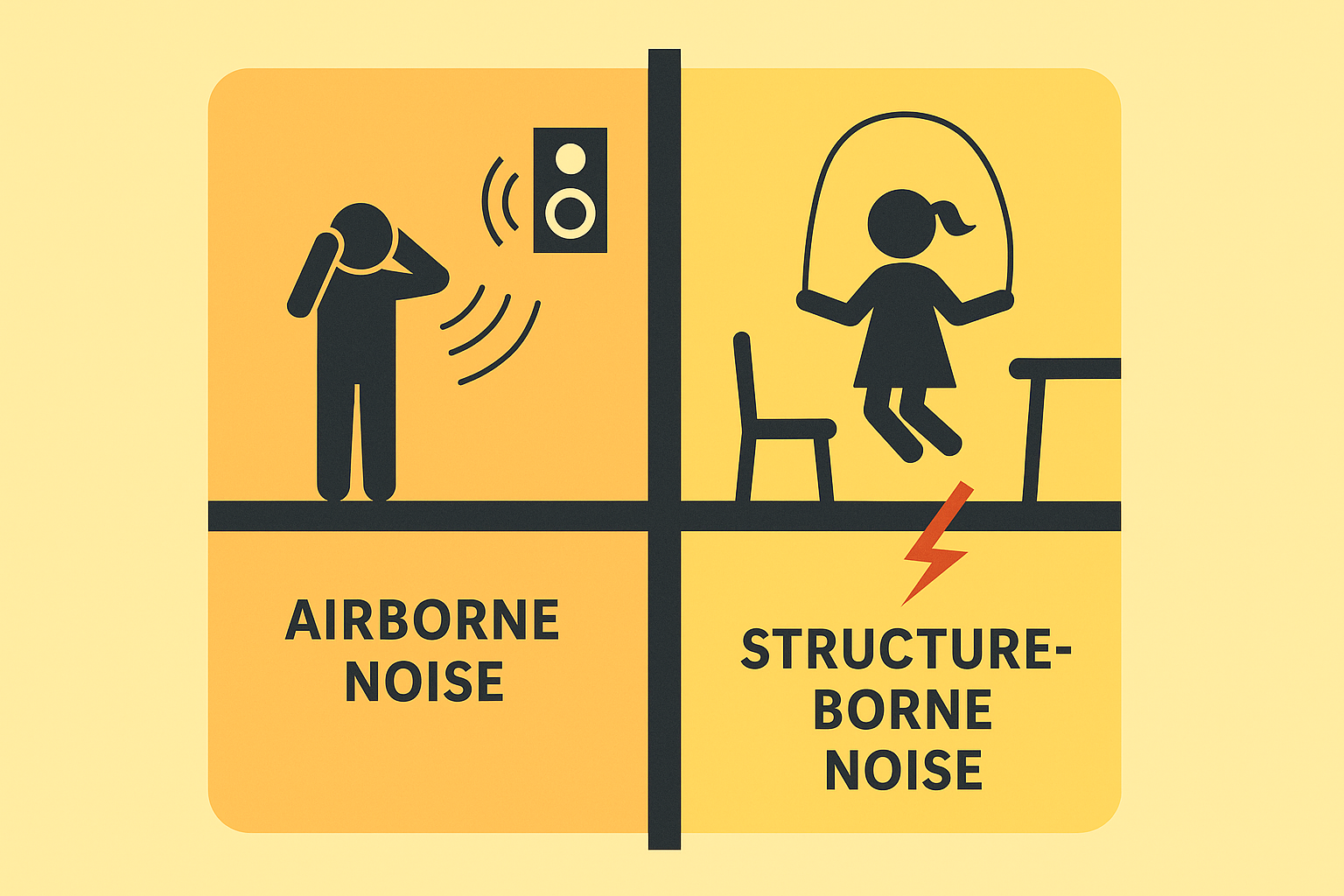 除了空氣音,建築物本身也會因撞擊與震動產生噪音,例如樓上走動、跳躍、家具碰撞,這類聲音稱為樓板衝擊音,會透過樓板與牆面傳導,是多數住戶最頭痛的噪音來源之一。
