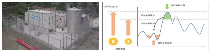 降低設備用電負荷高峰,以儲能系統支援尖峰與突發用電,避免用電超約罰款,利用EMS能源管理系統調節降低超約金額,約50-120萬元/年流動電費,再者無須提升用電契約容量,降低電費支出約110萬元/年基本電費。