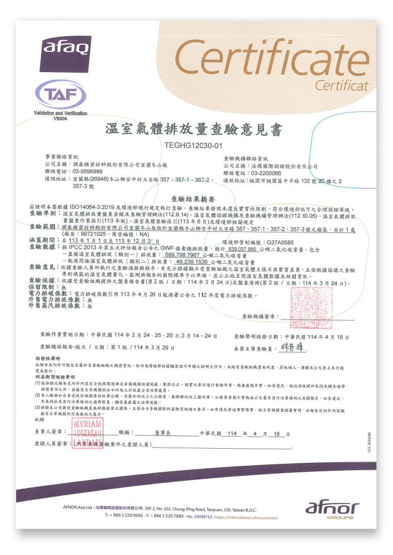 | 2024年度溫室氣體排放量查驗聲明-冬山廠 (點此放大瀏覽) |