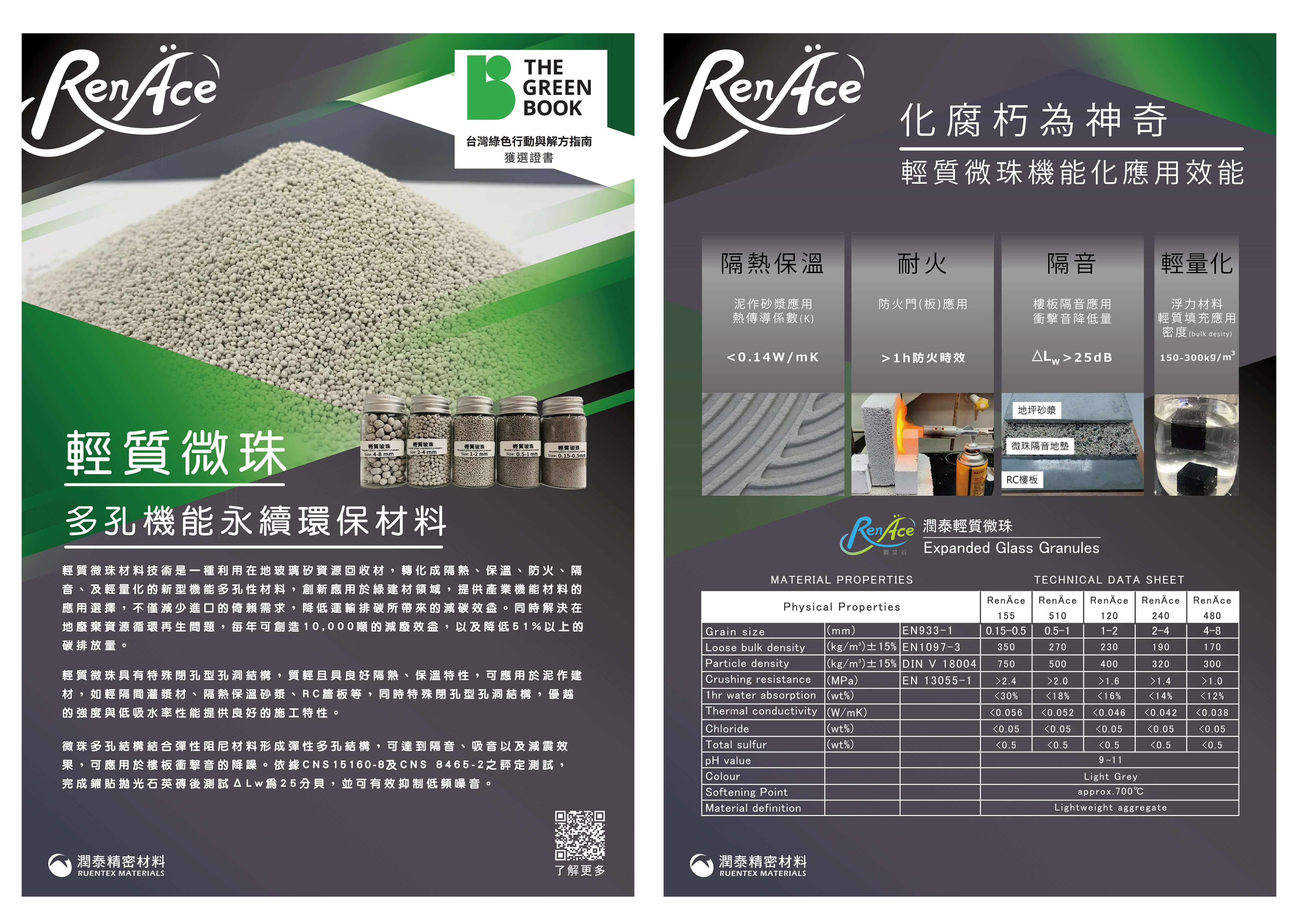 輕質微珠RenÄce蘊涵「重生」之意。潤泰團隊100%自行研發,將玻璃或含矽廢料,重新賦予新生命,使用超過90%玻璃廢料產製而成。輕質微珠的誕生,不僅意味著我們正積極為所居住環境以及產業永續,進行廢棄物去化與再生,作出有意義的貢獻,為地球環境創造光明與潔淨未來,同時也帶給人類一全新節能減碳模式及環保再生永續材料。