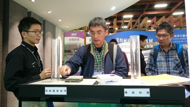 此外,樓上、樓下傳來的噪音是導致鄰居感情惡化的主要原因,潤泰精密推出的「隔音地坪」利用軟式地板來吸收地板噪音,每平方米連工帶料需再加上1,200台幣。現場也有模型讓業者測試聲響。