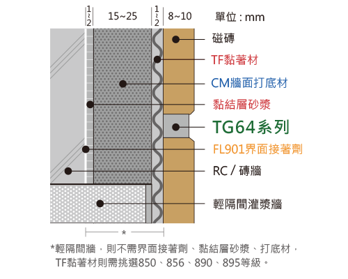 | 適合室內外牆面磁磚、地磚、馬賽克、大理石及花崗石填縫使用,磁磚縫寬3~10mm。 |