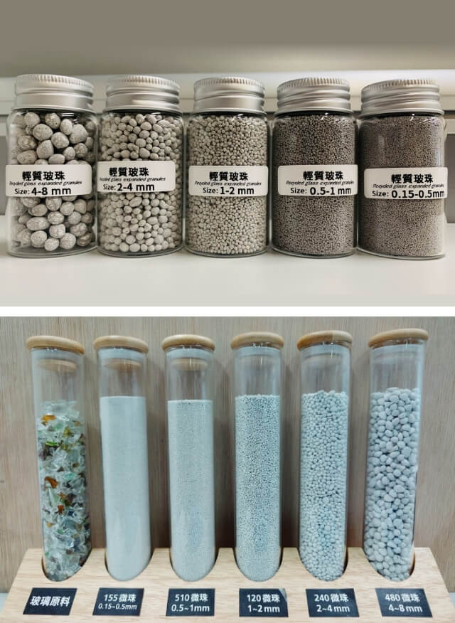 將無法去化再利用的玻璃廢料,轉化優質發泡顆粒材料的創新技術,透過礦化反應,形成具有高溫膨化特性材料,於高溫環境經膨化反應,形成輕質微珠,生產粒度從0.15~8mm甚至更大。體積密度約140~400kg/m³之間。